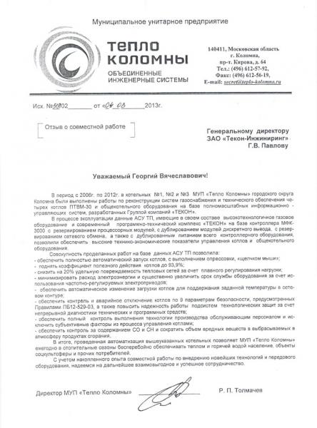 Отзыв МУП «Тепло Коломны» о совместной работе по автоматизации котельных