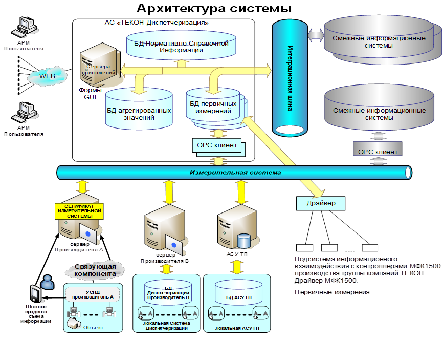 1. Первичные данные в виде унифицированных сигналов значений давлений, расходов, температур, состояния дискретных сигналов 0-1 и проч. передаются в контроллеры автоматики, смонтированные на объектах. Контроллеры по запросам системы или по расписанию передают данные по OPC OLE FOR PROCESS CONTROL STANDARD протоколам, либо по протоколу связующего драйвера в базу данных.